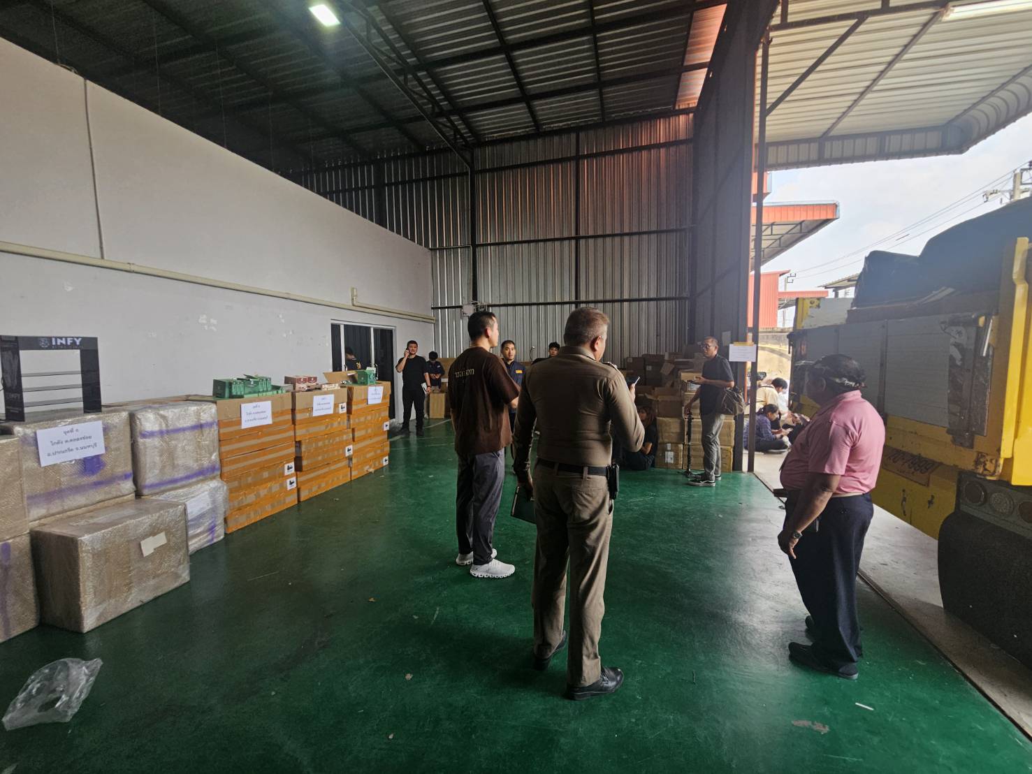 จากนั้นเจ้าหน้าที่ตำรวจจึงได้นำหมายค้นไปทำการตรวจค้นจุดที่4 อาคารไม่มีเลขที่ ซ.เจริญสุข ต.บางบัวทอง อ.บางบัวทอง จ.นนทบุรี ผลการตรวจค้นพบ 14.บุหรี่ไฟฟ้าชนิดพร้อมสูบ จำนวน 9,480 ชิ้น ,15.หัวน้ำยาบุหรี่ไฟฟ้า จำนวน 32,700 บาท 16,ขวดน้ำยาบุหรี่ไฟฟ้า จำนวน 32,740 ชิ้น