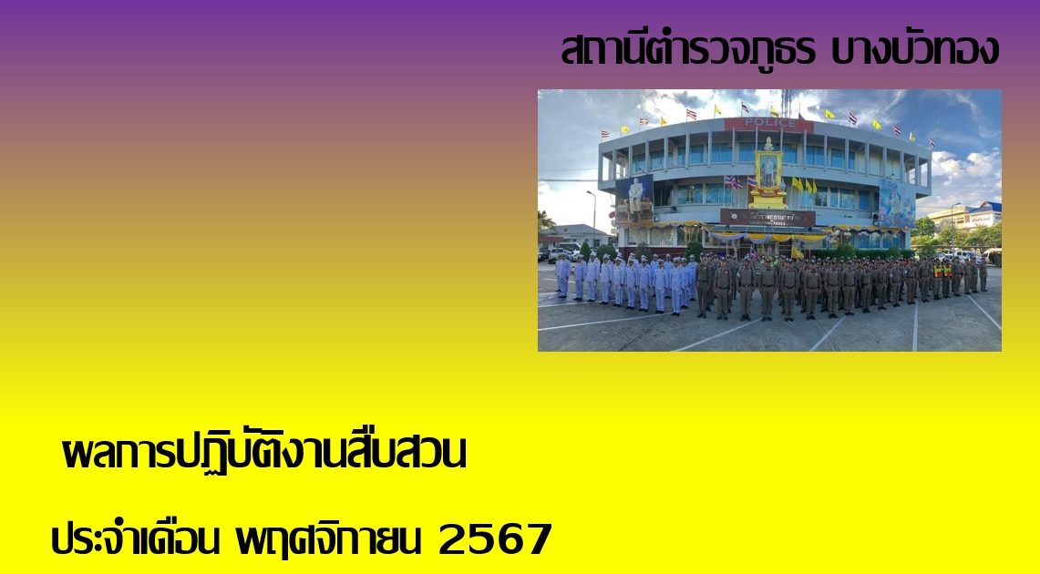 ผลการปฏิบัติงานสืบสวน เดือน พฤศจิกายน 2567 พฤศจิกายน 30, 2024 โดย detective.bangbuathong@gmail.com / งานสืบสวน 📌ประจำวันที่ : 22 พ.ย. 2567 เวลา 06.00 น.(right) ภายใต้การอำนวยการ : พ.ต.อ.พฤฒ จำรูญศาสน์ ผกก.สภ.บางบัวทอง และ พ.ต.ท.นเรนทร วีระ รอง ผกก.สส.สภ.บางบัวทองผู้ปล่อยแถว : พ.ต.ท.สุภกร แสงจันทร์ สว.สส.สภ.บางบัวทอง⭐️ ภารกิจปล่อยแถวกวาดล้างอาชญากรรมกรรมสภ.บางบัวทอง